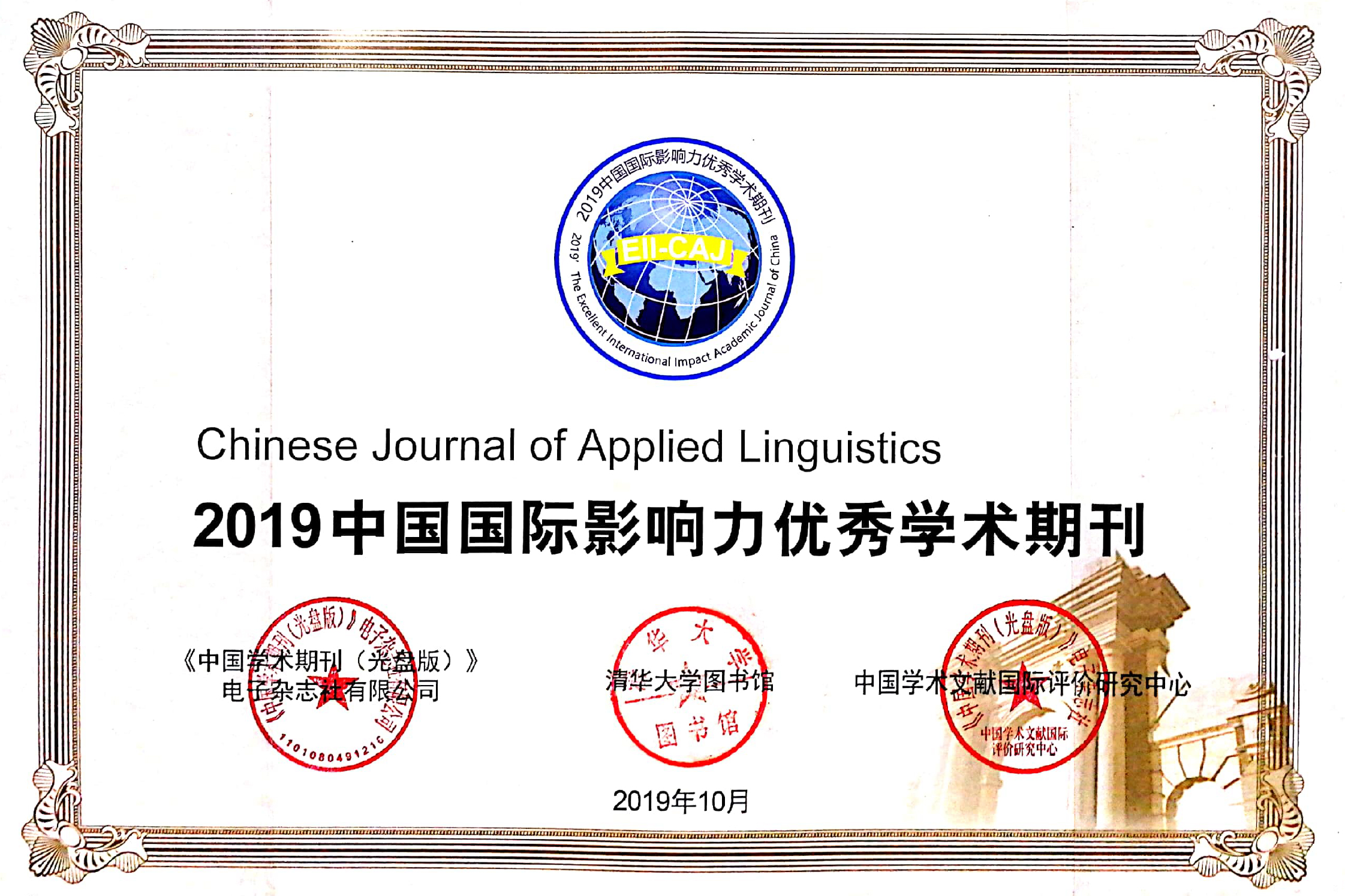 2019 年 10 月底,中国学术文献国际评价研究中心和清华大学图书馆联合研制的《中国学术期刊国际引证年报2019版》由《中国学术期刊(光盘版)》电子杂志社发布。《中国应用语言学(英文)》(Chinese Journal of Applied Linguistics,CJAL)获评为 “2019中国国际影响力优秀学术期刊(人文社会科学)”。