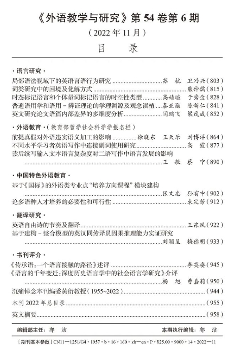 提要:违实句的理解需要构建双重心理表征,这一过程会受句法、语义、语用、语境等多种因素的影响。目前有关违实语义的实证研究主要局限于母语领域。在外语环境下违实语义是否能够顺利激活双重表征,以及前提和语境知识如何影响外语环境下的违实推理,目前尚不清楚。本文采用自定步速阅读技术,考察前提知识的真假以及外语水平的高低如何影响违实推理。研究发现,对于高水平中国外语学习者来说,当前提命题为真时,违实推理能够顺利展开,而当前提命题为假时,违实推理无法正常进行;对于低水平学习者来说,无论前提真假与否,违实推理均无法正常展开。这表明,在外语环境下,违实推理会受语境和外语水平的双重影响。当外语水平达到一定程度时,外语环境下的违实推理与母语环境下的违实推理均受前提知识真假的约束;但当外语水平一般时,违实推理就会遇阻,前提知识也无法对违实推理产生影响。