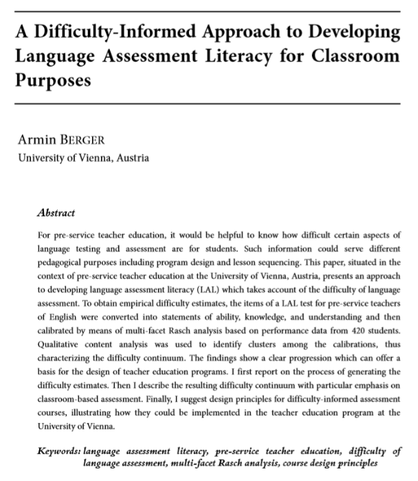 摘要:在职前教师教育过程中,了解语言测试和评估某些方面的难度对学生来说会很有帮助。这些信息可以服务于不同的教学目的,包括课程设计和上课顺序。本文以奥地利维也纳大学的职前教师教育为背景,提出了一种考虑课堂语言评估的难度从而提高语言评估素养(LAL)的方法。为了得到难度估计实证数据,将职前英语教师LAL测试的项目转换为对能力、知识和理解的陈述,然后根据420名学生的表现数据通过多面Rasch分析进行校准。定性内容分析用于识别校准之间的聚类,从而分出难度等级。研究结果显示了清晰的等级级数,可以为教师教育计划的制定提供依据。本文首先报告了测评课堂语言评估难度的过程,然后描述了课堂语言评估的难度等级。最后,笔者提出了基于难度等级的课堂语言评估类课程的设计原则,并介绍了笔者在维也纳大学的教师教育计划中实施这些原则的具体实践。